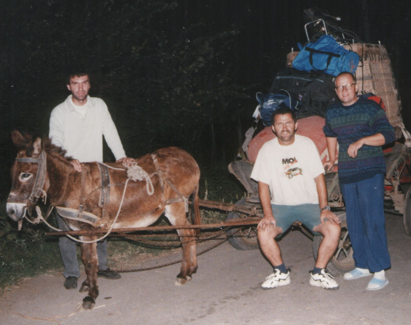 Mint a képen is látszik, van amikor a csapat együtt kerül nehéz helyzetbe. A követő autónk meghibásodása miatt, azt hiszem nekünk volt a világ legkörnyezetbarátabb ballonos járművünk. A negyedik csapattagot Samunak hívják és Romániában a bolgár határ közelében volt "szerencsénk" megismerkedni vele. |